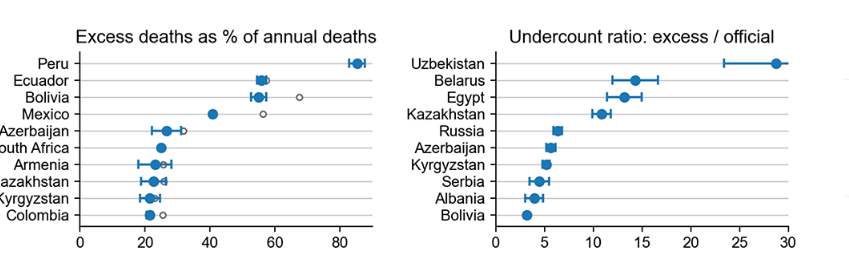 Using this baseline, the authors can show that Peru and several other Latin American countries in 2020 had the highest relative increase in deaths per 100,000 people. These countries were followed by Kazakhstan (with 22 percent more deaths than expected) and Kyrgyzstan (19 percent). Russia also ranked high (15 percent), with a spike that continues to this day. (In the South Caucasus, the authors correct to account for the roughly 6,000 deaths attributed to the autumn war between Armenia (15 percent higher after the correction) and Azerbaijan (8 percent).)