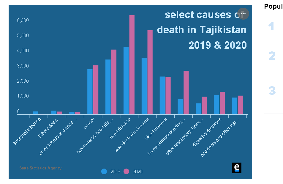 According to an annual digest produced by the State Statistics Agency that has been obtained by Eurasianet, 41,743 people died in Tajikistan last year. That is 8,649 more than in 2019 and a 26 percent increase over the average number of deaths recorded annually between 2015 and 2019.