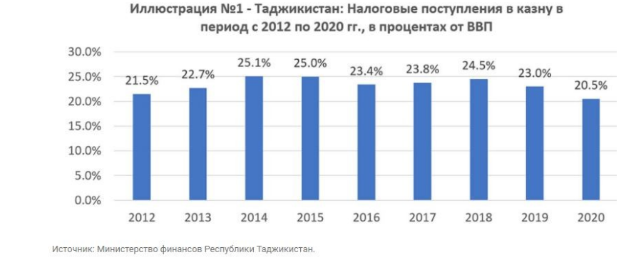 The World Bank experts note that while Tajikistan’s tax revenues have been close to the average for lower-middle-income countries, in the wake of the COVID-19 pandemic, its tax-to-GDP ratio dropped from 23 percent GDP in 2019 to 20.5 percent of GDP in 2020, reaching the lowest level in the past decade.