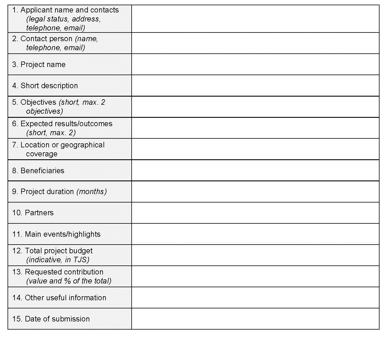 Applicants shall submit a brief description (max. 5 A4 page, Arial 10) of the project idea/project concept in English, in the electronic form (Word format). Proposals shall either be emailed to [email protected] or delivered in electronic form at the SCO at Tolstoy Str, 3 in Dushanbe.