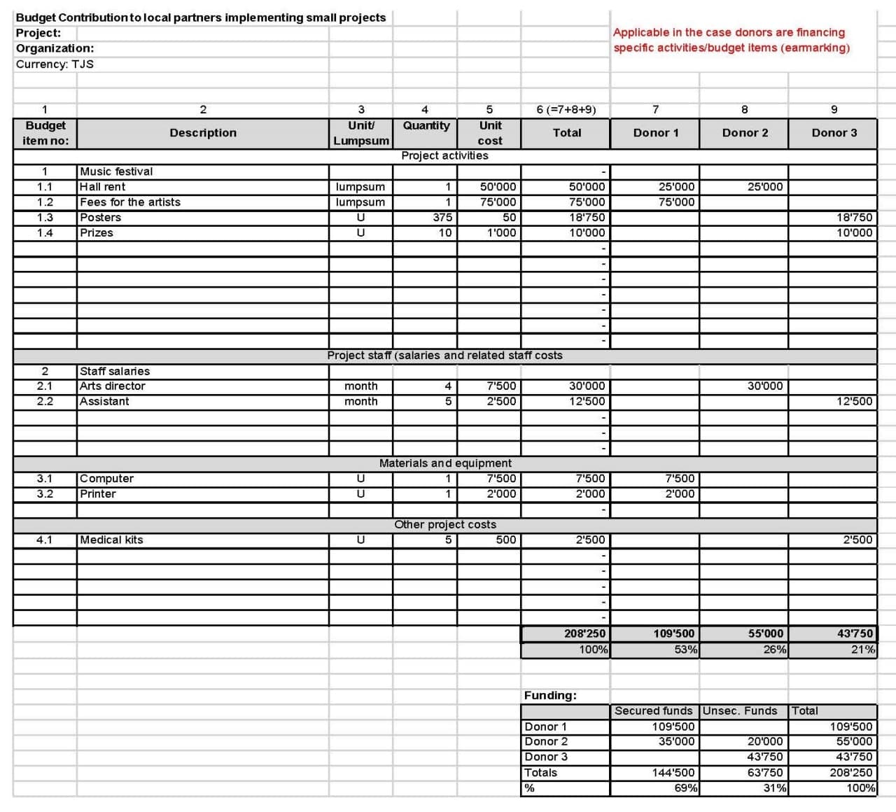 - Detailed budget according to the SCO template with indication of all external contributions (in- kind and/or in cash), from the organization or by other supporters