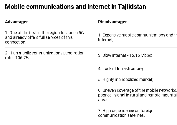 In general, despite the fact that there are five mobile operators in the country, Tajikistan ranks last in world rankings by many criteria.  All this points to an underdeveloped market, high monopoly and low competitiveness of local communication providers.  This, in turn, leads to high prices and low quality, poorly developed infrastructure, and inaccessibility of the network in some villages and remote corners of the country.