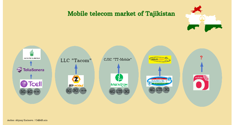 There are five operators on the Tajik mobile market: MegaFon Tajikistan; Tcell; Babilon-T; ZetMobile; and O Mobile..