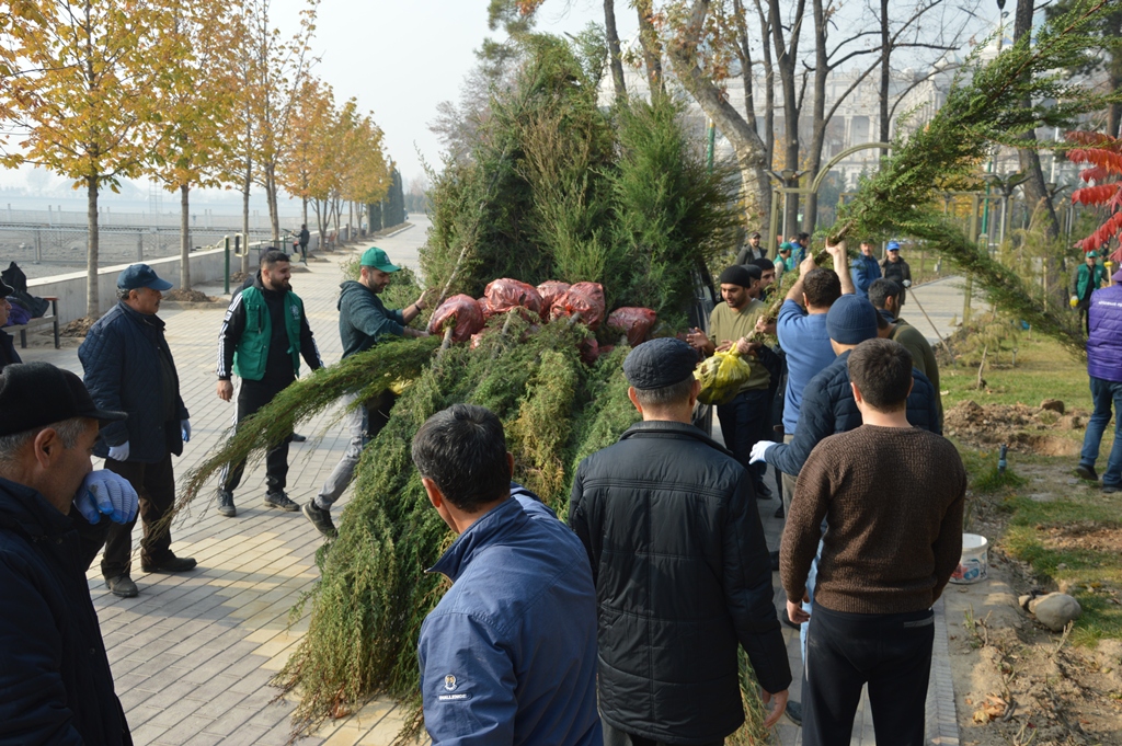 In this event, six types of trees, 200 shrubs were planted, including local pine (75 pcs), black cypress (30 pcs), white cypress (30 pcs), juniper (35 pcs), plane tree (5 pcs) and majnunbed (weeping willow — 25 pcs).