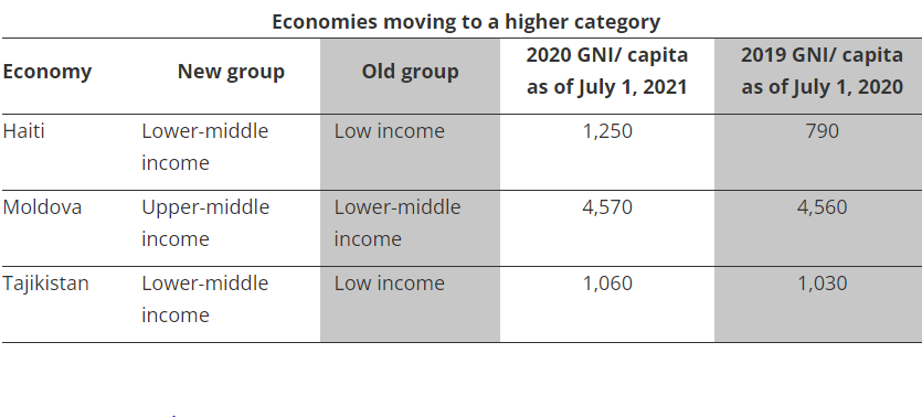 The World Bank assigns the world’s economies to four income groups—low, lower-middle, upper-middle, and high-income countries. The classifications are updated each year on July 1 and are based on Gross National income (GNI) per capita in current USD (using the Atlas method exchange rates) of the previous year (i.e. 2020 in this case).
