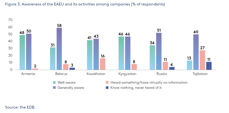 Tajikistan, which is not a member of the Union, has the lowest awareness among companies – a third of respondents are poorly aware of the EAEU, while another 11% said that they had never heard of it before.