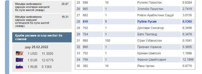 As far as the official exchange rate of the Russian ruble in Tajikistan is concerned, it increased from 1:0.133 on February 25 to 1:0.1365 on February 28.