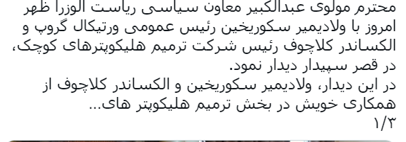 Inamullah Habibi Samangani, deputy central spokesman for the Islamic Emirate of Afghanistan (IEA), tweeted today that Maulawi Abdul Kabir, Deputy Chairman of the Taliban Cabinet for Political Issues, has met with Vladimir Skurikhin, Russia’s Vertical Group CEO, and Aleksandr Kalachyov, Chairman of the Helicopter Repair Company, at Sapidar Palace in Kabul.