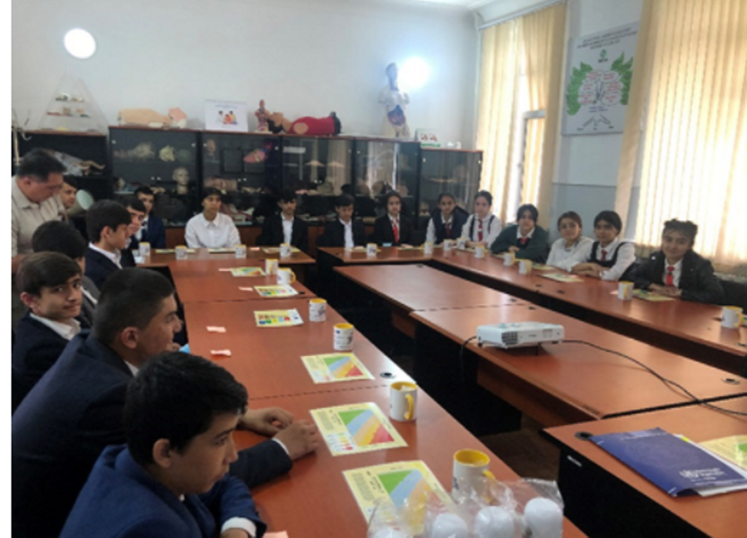 As part of the event, a quiz on health issues and session on healthy lifestyle were conducted. There were interesting discussions about healthy food and existing trends towards fast food. The percentage of obesity is increasing rapidly, which affects the health status among the entire population. Schoolchildren were presented with WHO nutrition recommendations, which include maintaining proper energy metabolism and normal weight, switching from saturated to unsaturated fats, avoiding trans-unsaturated fats, as well as to increase the consumption of fruits, vegetables, legumes, nuts, and whole grain foods. To limit the intake of sugar and iodized salt was also a topic. School children and teachers were trained to determine and calculate Body Mass Index (BMI), and to determine their own BMI.
