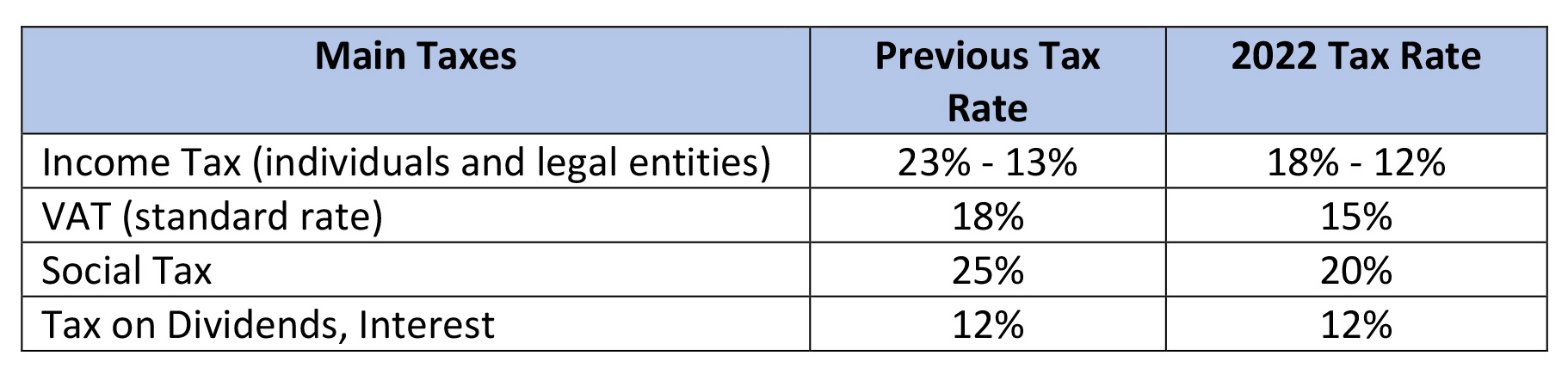 It also lowers the VAT rate from 18 to 15 %, the income tax for legal entities from 23 to 18 % and for individuals from 13 to 12 %.