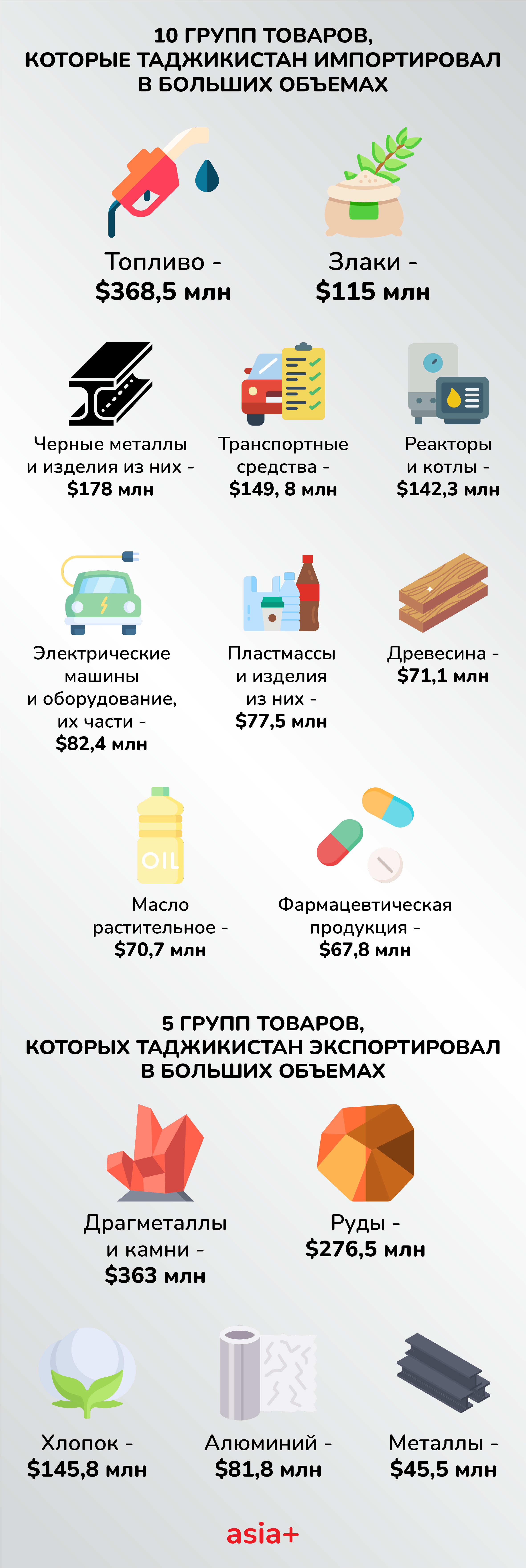 Over the same five-month period, the top imports of Tajikistan were: fuels — 368.5 million U.S. dollars; cereals — 115 million U.S. dollars; ferrous metals and products from them — 178 million U.S. dollars; motor cars and other motor vehicles –149.8 million U.S. dollars; reactors and boilers 142.3 million U.S. dollars; electric equipment — 82.4 million U.S. dollars; plastics and products from them — 77.5 million U.S. dollars; timber — 71.1 million U.S. dollars; vegetable oils — 70.7 million U.S. dollars; pharmaceutical products — 67.8 million U.S. dollars