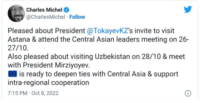 “Pleased about President Tokayev’s invite to visit Astana and attend the Central Asian leaders meeting. Also pleased about visiting Uzbekistan on October 28 and meet with President Mirziyoyev,” Charles Michel tweeted on October 8.