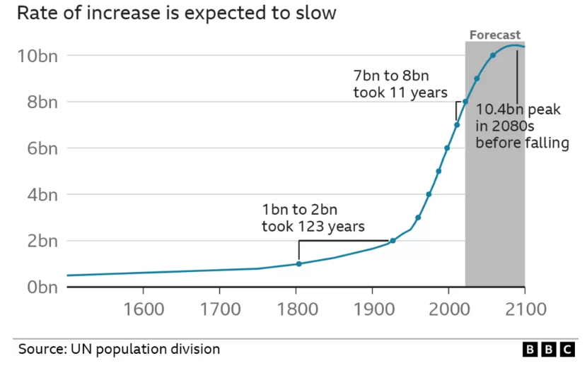 The UN says the world's population has hit eight billion, just 11 years after passing the seven-billionth milestone. After a big surge in the middle of the 20th Century, population growth is already slowing down. It could take 15 years to reach nine billion and the United Nations doesn't expect to reach 10 billion until 2080.