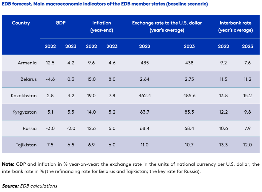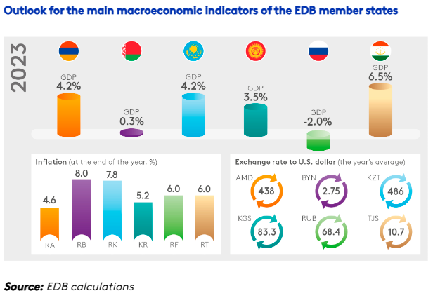 Bank analysts expect the region’s economies to continue adapting to the new environment. In terms of economic developments in 2023, Russia’s GDP is projected to decline by 2% while the other countries will see growth in their GDPs: Armenia by 4.2%; Belarus by 0.3%; Kazakhstan by 4.2%; Kyrgyzstan by 3.5%; and Tajikistan by 6.5%.