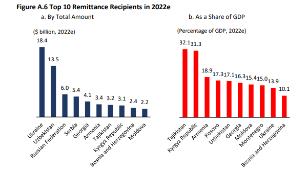 The report notes that for many Central Asian and Southern Caucasus nations within the CIS, Russia has been a major source of remittances, accounting for more-than half of total flows for Armenia, Azerbaijan, Kyrgyzstan, Tajikistan, and Uzbekistan. It was anticipated that remittances to the CIS would plummet in the wake of the Russian invasion of Ukraine. But Kyrgyzstan, Tajikistan, and Uzbekistan likely received record high amounts of remittances from Russia in 2022, as the number of migrant workers in Russia from Central Asia remained strong (in part due to a strong ruble).