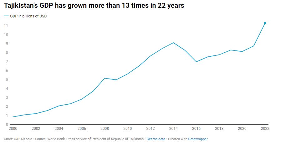 Tajikistan’s GDP has reportedly grown more than 13-fold over the past 22 years, from US$0.86 million in 2000 to US$11.3 billion in 2022.