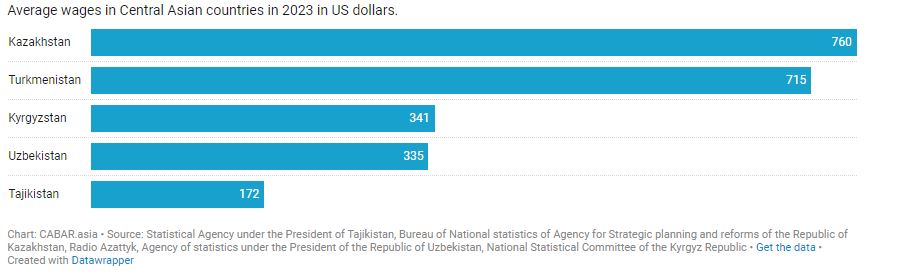 The average monthly wage in Kazakhstan in 2023 was 340,000 tenge (about US$760). The average salary in Turkmenistan, according to official data, is US$715; in Kyrgyzstan, it is about 30,000 soms (US$341); and in Uzbekistan, 3.72 million soms (US$335) by the end of 2022.