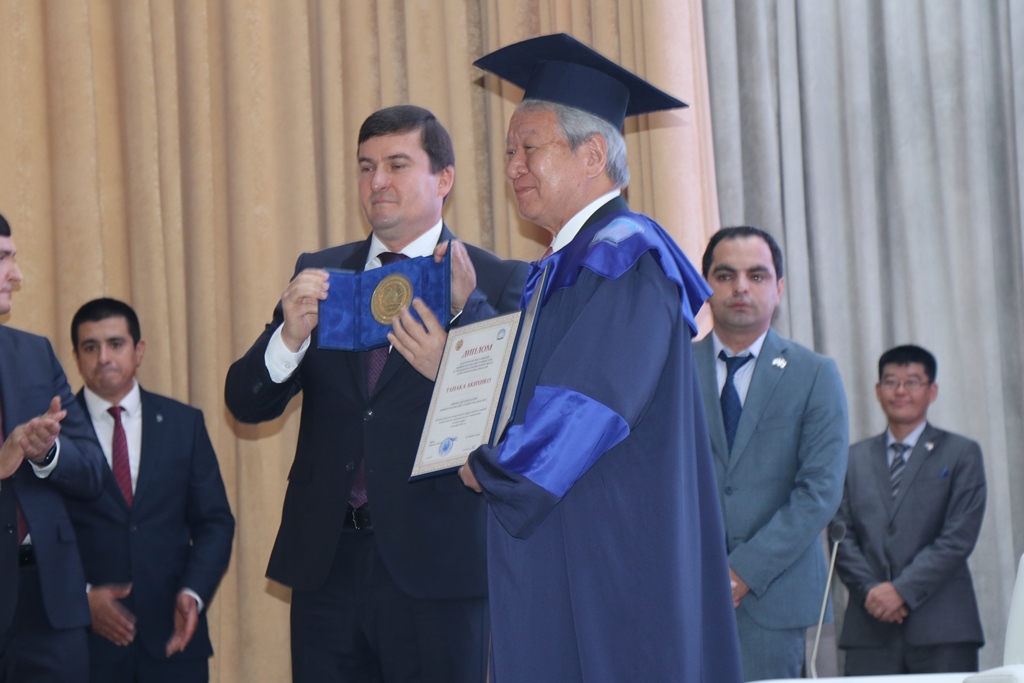 At the beginning of the event, the university administration awarded Tanaka Akihito the title of honorary doctor and presented a commemorative medal.