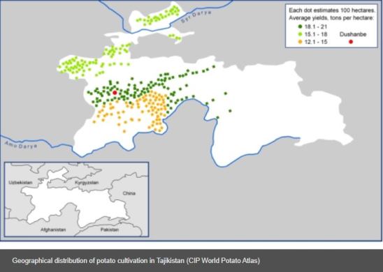 Potato is a widely grown crop in Tajikistan, most likely cultivated primarily at higher altitudes than areas dedicated to other principal crops, especially wheat and cotton.
