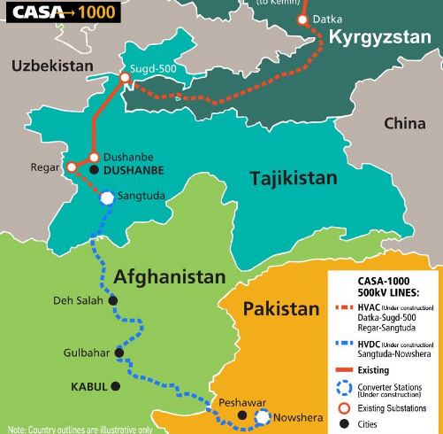 The Project is expected to develop the necessary physical infrastructure and create the institutional and legal framework to transmit surplus power available from existing generation facilities in Tajikistan and Kyrgyzstan to Afghanistan and Pakistan. The physical infrastructure for CASA 1000 includes: a 500 kV high voltage direct current (HVDC) transmission system between Tajikistan and Pakistan through Afghanistan; an AC transmission link from Kyrgyzstan and Tajikistan to connect to the HVDC line from Tajikistan to South Asia; and the necessary electricity sub-stations in Kabul (Afghanistan), Peshawar (Pakistan) and Sangtuda (Tajikistan).