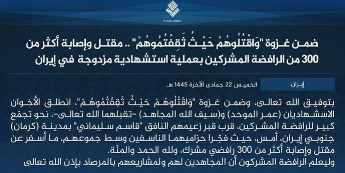 Iran’s official news agency IRNA reported yesterday afternoon that “the Daesh (Daesh is the acronym for the group's full Arabic name, al-Dawla al-Islamiya fi al-Iraq wa al-Sham) terrorist group has claimed responsibility for the Wednesday attacks in Iran’s southeastern city of Kerman that left 84 people dead.”