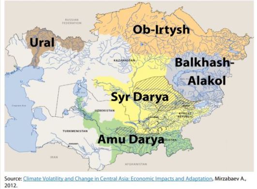 The five main river basins in Central Asia are formed by the Amu Darya, Syr Darya, Balkhash-Alakol, Ob-Irtysh, and Ural rivers.