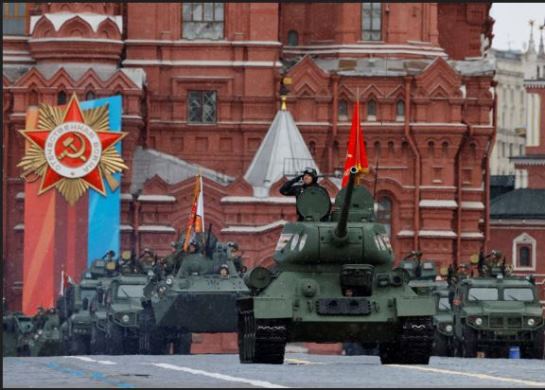 Over 9,000 military personnel took part in the parade. The mechanized column was led by a World War II-era T-34 tank, a symbol of the Soviet victory over Nazi Germany in World War