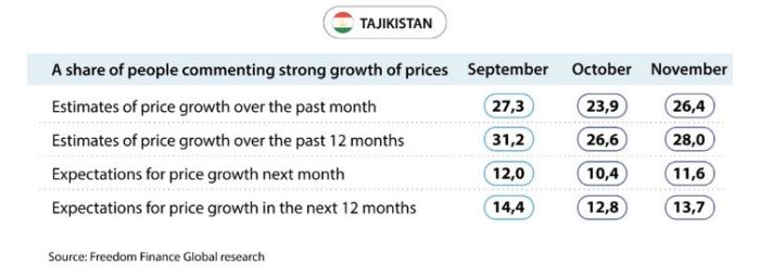 Devaluation expectations among Tajikistanis strengthened again. In November, the exchange rate of the dollar to the somoni rose by more than 2.0%, marking the most significant increase since February 2023. The proportion of respondents anticipating a weakening of the national currency within a year increased from 23.1% to 28.8%.