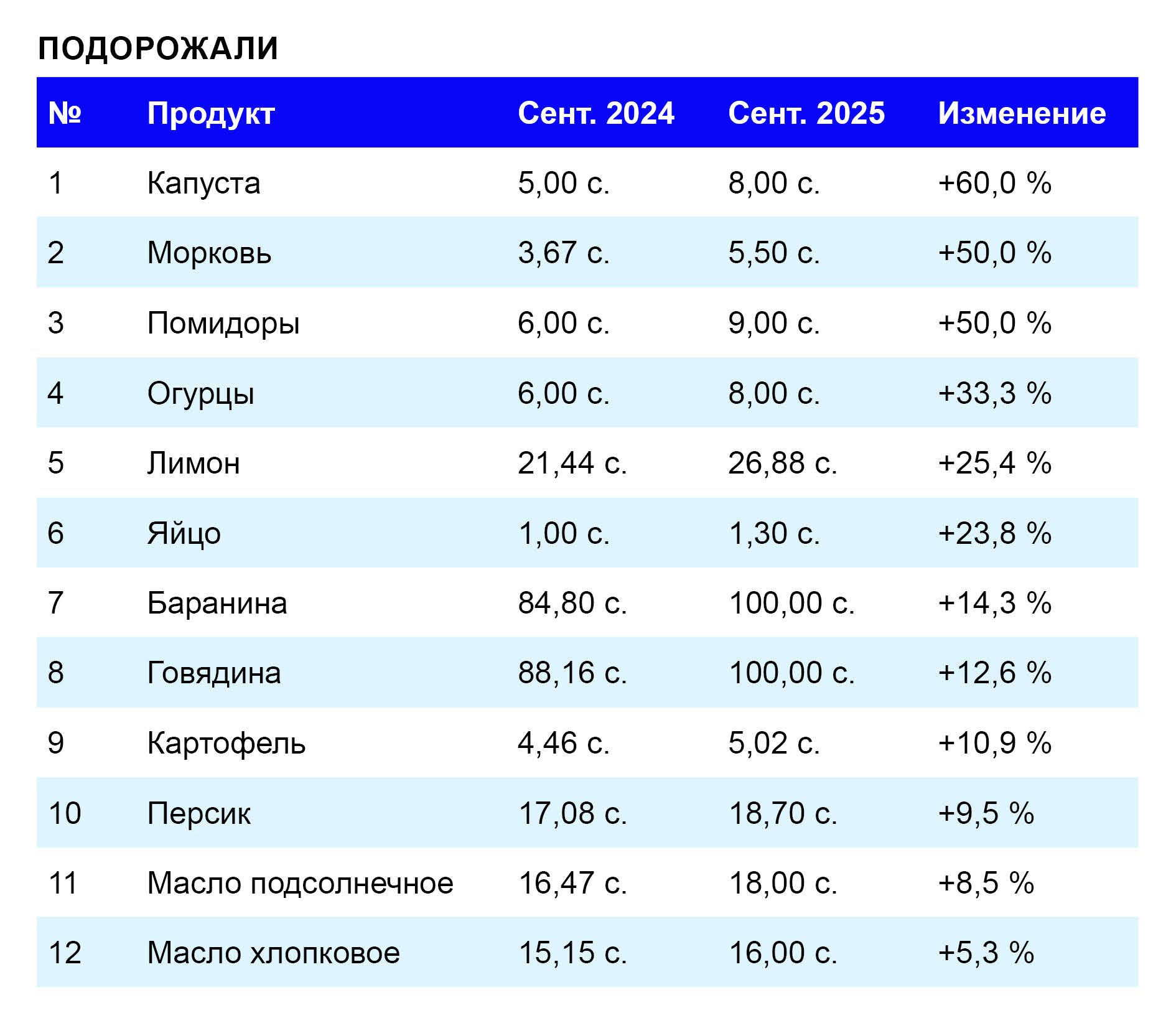 Among vegetables, cabbage saw the steepest price hike — up 60%, rising from 5.00 to 8.00 somonis per kilogram. Carrots followed with a 50% jump, from 3.67 to 5.50 somonis.
