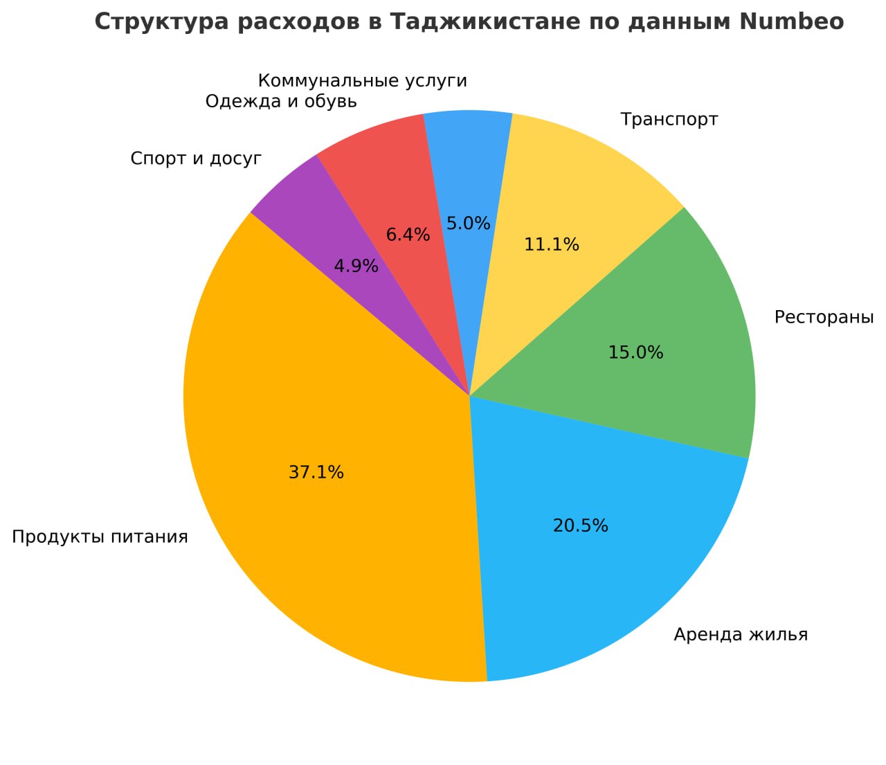 In Tajikistan, food remains the largest expense category at 37.1%. Housing rent accounts for 20.5%, restaurant visits — 15%, transportation — 11.1%, and utility bills — 5%.