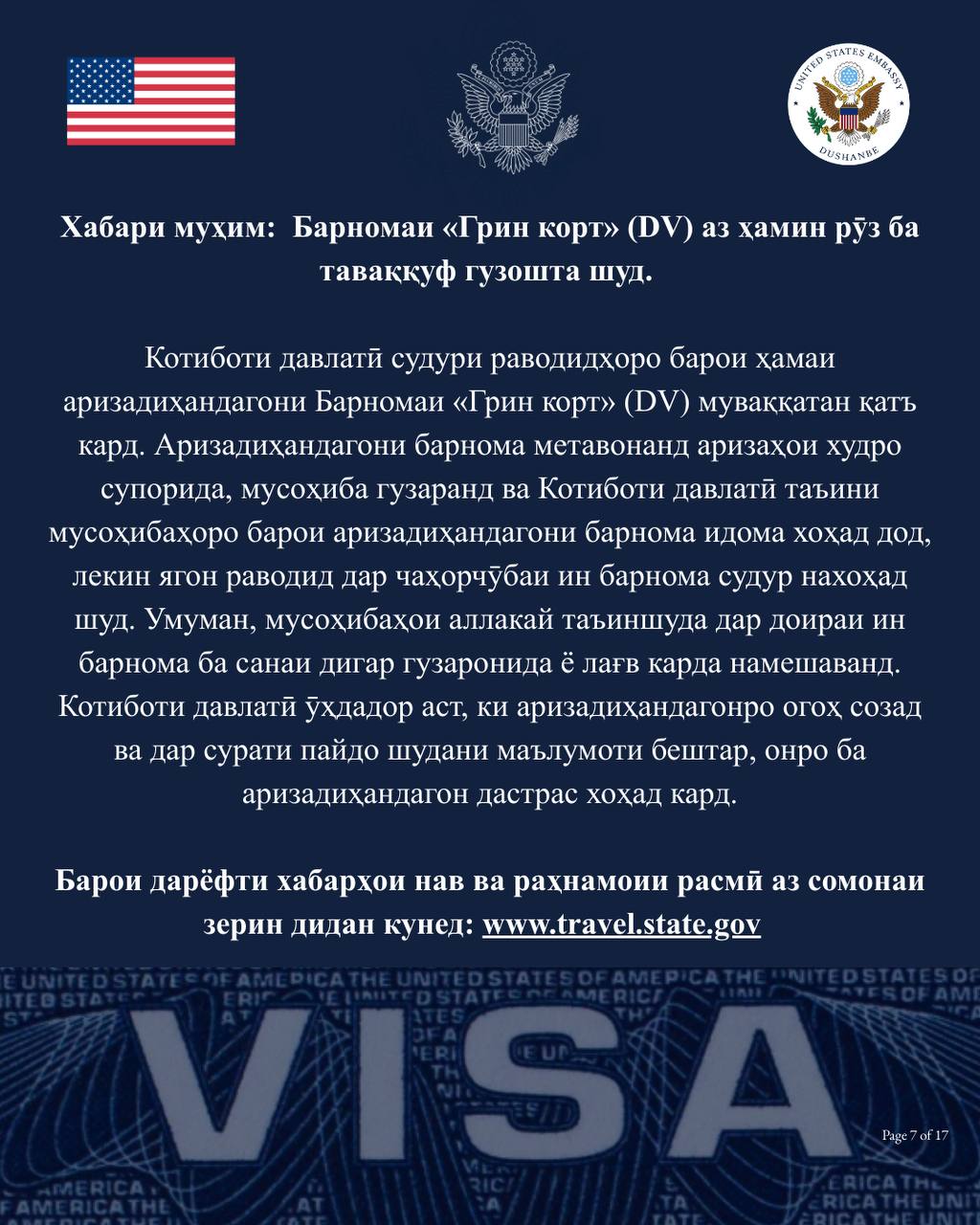 The US Embassy in Dushanbe has officially confirmed the suspension of the Green Card lottery program, as announced by the US Department of State.