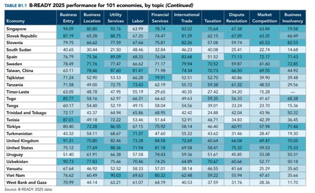 The World Bank has released its Business Ready (B-READY) 2025 report, which evaluates the business and investment climate across countries. The report covers 101 economies, including Tajikistan.