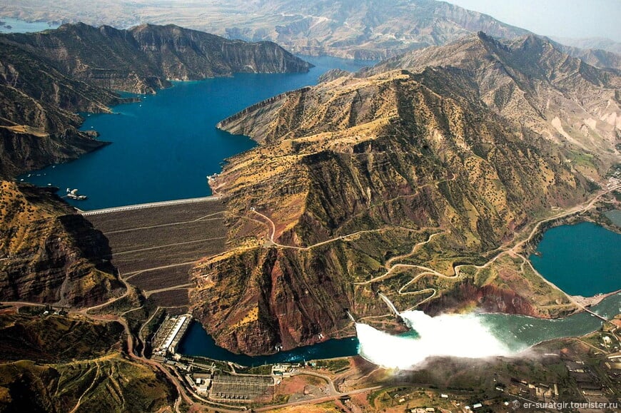 From observation points, visitors can admire the turquoise waters of the Nurek Reservoir.
