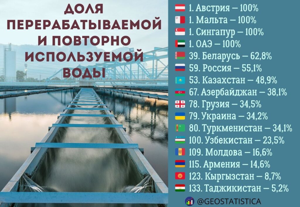 According to the Environmental Performance Index data for 2024, Tajikistan ranks among the last in the world in terms of the share of recycled and reused water — about 5.2%. However, the Ministry of Energy and Water Resources of Tajikistan claims that 8% of all return waters are reused for irrigation.