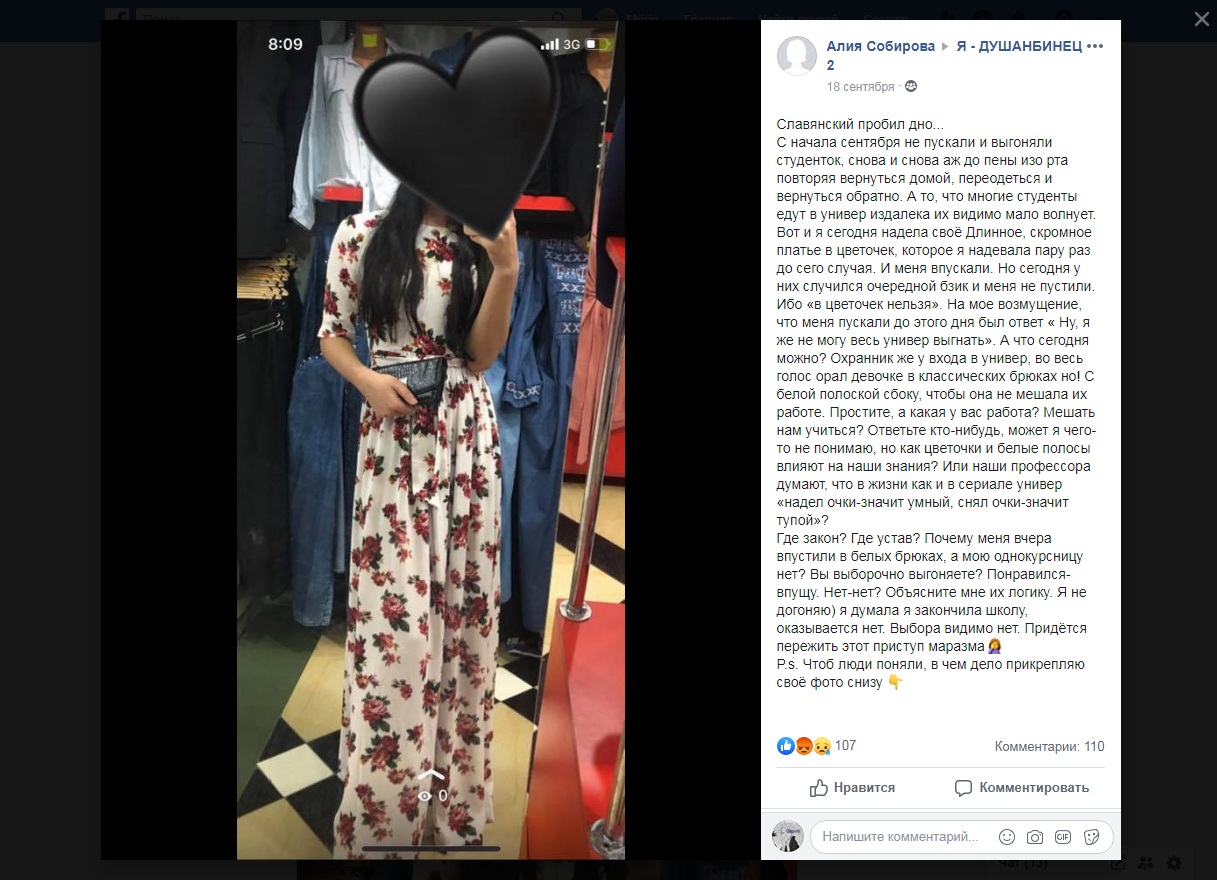 — Мы выяснили, что студентки по имени Алия Собирова у нас нет, и этот аккаунт, скорее всего, фейковый. Я читала и сам пост, и комментарии. Из-за какого-то платья люди стали унижать честь и достоинство нашего ВУЗа, — говорит она.