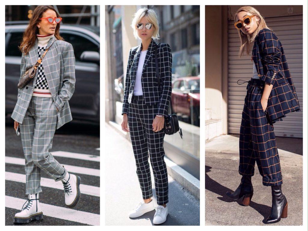 Брючные костюмы с клетчатым принтом в этом году также пользуются сезоном славы. Они выглядят очень женственно, и подходят не только для женщин с деловой хваткой, но и молодых домохозяек, желающих примерить лаконичный и элегантный образ.