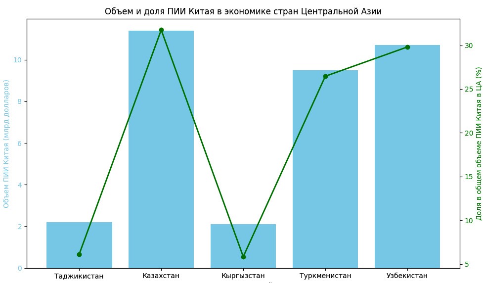 Общий объем китайских ПИИ в Казахстане на 2025 год составляет $11,4 млрд, при этом китайские компании активно инвестируют в обрабатывающую промышленность, энергетику и инфраструктуру.