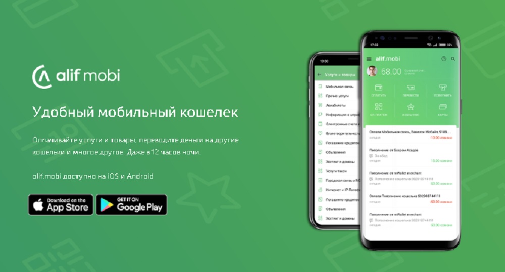 Например, с помощью кошелька Alif mobi можно платить за мобильную связь, коммунальные услуги, городскую связь, банковские услуги, авиабилеты и путешествия, онлайн игры, социальные сети, объявления, такси, таджикские интернет-магазины, кабельное и спутниковое ТВ, образование в нескольких центрах и школах города Душанбе.