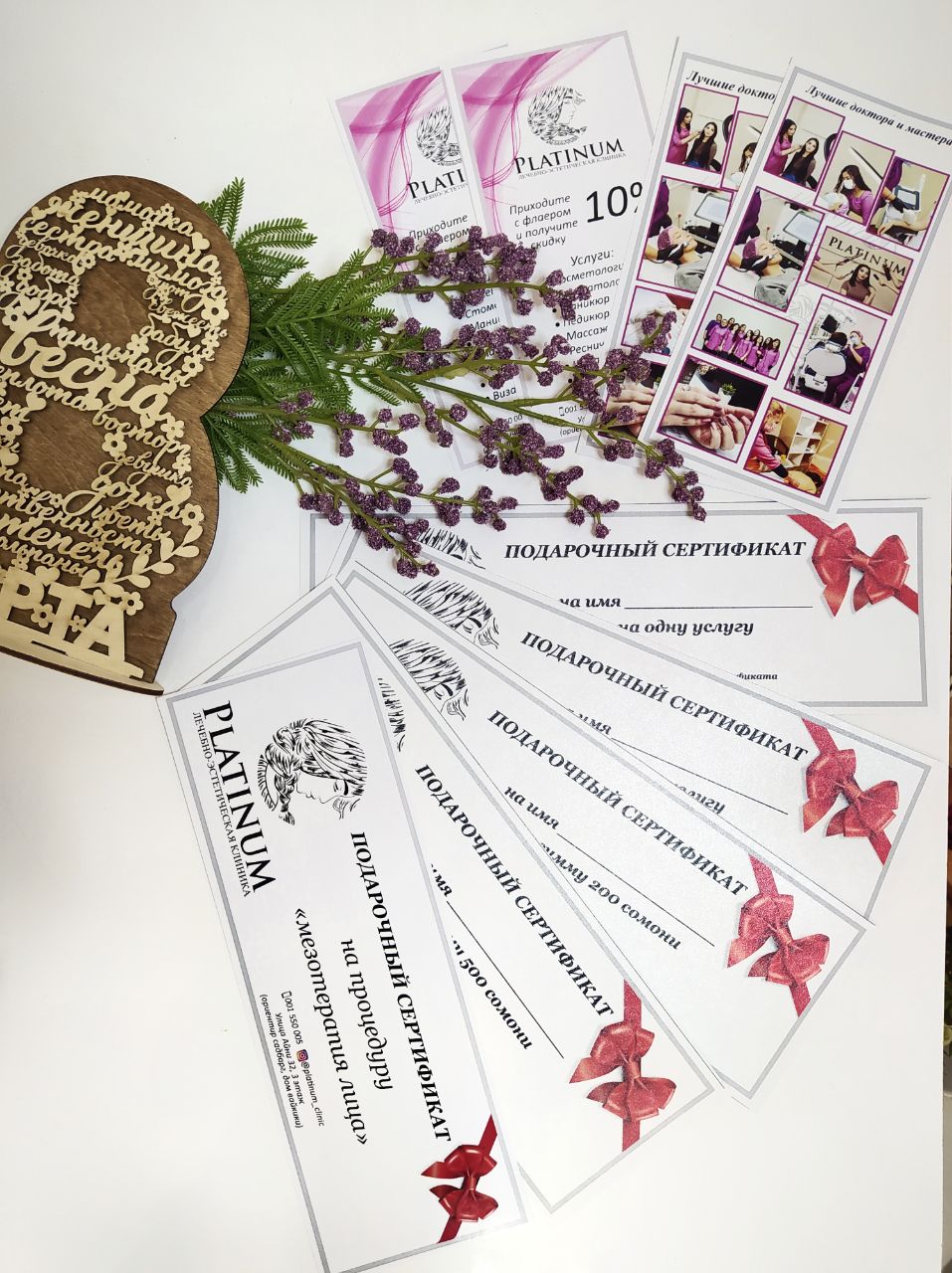 Клиника предоставляет множество подарочных сертификатов и скидок, вы можете приобрести сертификаты: на сумму 200 и 500 сомони, на разовые или целый комплекс процедур, а также 10% скидки на все процедуры. Пусть, в этот праздничный день, дорогая вашему сердцу женщина почувствует себя королевой!