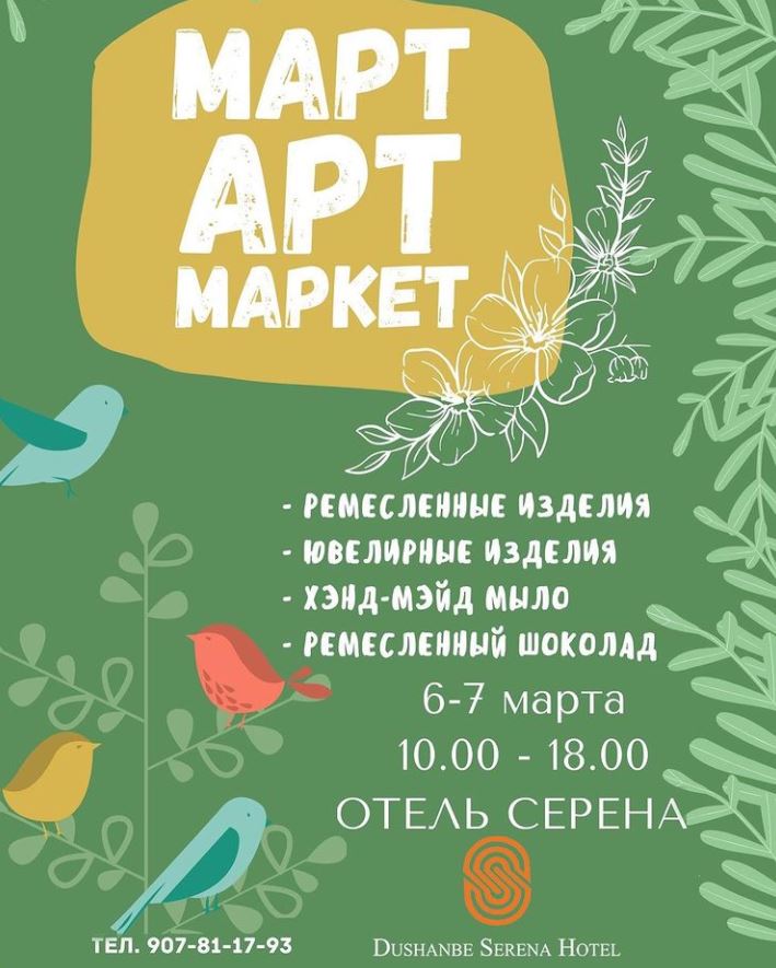 С 6 по 7 марта с 10 до 18.00 в отеле "Серена" пройдёт МартАртМаркет – первая весенняя ярмарка ремесленников. Всё самое лучшее, креативное, вкусное — в одном месте! Продукция ремесленников, ювелирные изделия, бижутерия, крафтовый шоколад, ремесленное мыло, фруктовая пастила и чипсы, эко-сумки и оригинальные шопперы — всё это можно приобрести в качестве подарка накануне замечательного праздника 8 марта!
