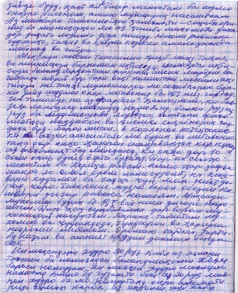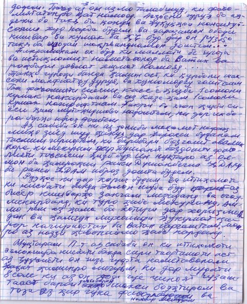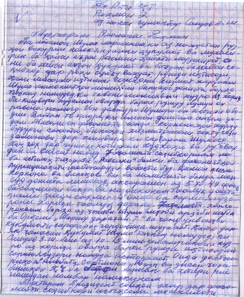 Бо баргузории мурофиаи судӣ ва ошкор шудани ҳамаи паҳлӯҳои ин иттиҳомот бевосита ба обрӯи давлатамон, ки даъвои ҳуқуқбунёдӣ мекунад, латма ворид мекунад. Ин сатрҳоро дар ҳолати дарди шадиди меъда дар зиндон менависам, то ба ин лаҳза қариб ду моҳ интизор шудам, ки мақомоти дахлдор ҳамаи паҳлӯи фаъолият, ҳаракатҳои худ ва наздиконамро омӯхта, ба Шумо, умед дорам, маълумоти объективӣ дастрас мегардад. Боварӣ дорам, ки он ҳам ғайр аз ростӣ ва фикри ободии ин ватан чизи дигар набошад. Мутаассифона, муносибате, ки ба банда дар ин муддат раво дида шудааст, шояд нисбат ба ягон касоне, ки ба хиёнати Ватан даст мезананд, набошад. Аз вохӯрӣ бо ҳимоятгар дар ин муддат маҳрумам. Онҳоро баъзан баъди ҳафтаҳо бо муфаттишон мебинаму халос. Наздикони худро ба ғайр аз кӯдакони хурдиям, ҳамонам бошад рӯзҳои дигар маҳрумам. Аз шунидани радио дар давоми 53 рӯз маҳрум будам, аз ташхиси духтурони касбӣ, ки вазъи саломатиям хеле бад аст, маҳрумам.