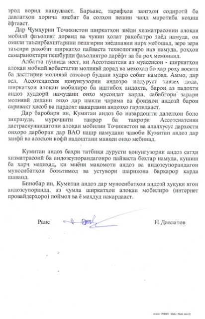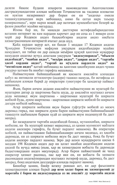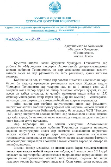 ХабарҶомеа Посухи Кумитаи андози ҷумҳурӣ ба Ассотсиатсияи дастраскунандагони алоқаи мобилии Тоҷикистон Кумитаи андози кишвар дар робита ба «Муроҷиати такрории Ассотсиатсияи дастраскунандагони алоқаи мобилии Тоҷикистон», ки қаблан дар воситаҳои ахбори омма нашр гашт, ба мактуби расмие посух дод. 3459 мактуби расмии Кумитаи андози Ҷумҳурии Тоҷикистон 20.08.2013 06:30 TelegramFacebookWhatsAppCopy URL Кумитаи андози кишвар дар робита ба «Муроҷиати такрории Ассотсиатсияи дастраскунандагони алоқаи мобилии Тоҷикистон», ки қаблан дар воситаҳои ахбори омма нашр гашт, ба мактуби расмие посух дод. Мавод ба ин забонҳо дастрас аст: Тоҷ Previous articleИсфара: Қатли як оила бо силоҳи оташфишонNext articleЭ.Раҳмон: 58,5 фоизи аҳолии кишвар ба сарчашмаҳои хушсифати оби нӯшокӣ дастрасӣ доранд Маводҳои монанд Кадом маҳсулот дар Тоҷикистон аз оғози сол гарон шуд? Интиқоли нафту гази Ӯзбекистон ба Тоҷикистон. Масъулини ду кишвар чӣ хулоса карданд? Дар се моҳи соли равон воридоти шакар ба Тоҷикистон кам шудааст Пурхонанда “Ака нагӯ”, “Рафиқ занак”… Дар Душанбе 85-солагии Убайдулло Раҷаб таҷлил шуд Нигаронӣ аз афзоиши гарду ғубор, густариши иқтисоди сабз ва барориши “вомбарг”-ҳо. Эмомалӣ Раҳмон дар Ҳамоиши экологӣ дар Остона чӣ гуфт? Парвоз дар масири Машҳад – Душанбе – Машҳад пас аз ҷанг дар Эрон азсар гирифта мешавад Кадом маҳсулот дар Тоҷикистон аз оғози сол гарон шуд? Содироти картошка аз Қазоқистон ба Тоҷикистон беш аз 250 баробар афзудааст Ба мо дар шабакаҳои иҷтимоӣ пайвандед! TelegramInstagramFacebookTiktokYoutube Ахбори тоза “Ака нагӯ”, “Рафиқ занак”… Дар Душанбе 85-солагии Убайдулло Раҷаб таҷлил шуд Мазҳаб Ҷумаев - "Азия-Плюс" аз ин маҳфил гузориш таҳия кард. Нигаронӣ аз афзоиши гарду ғубор, густариши иқтисоди сабз ва барориши “вомбарг”-ҳо. Эмомалӣ Раҳмон дар Ҳамоиши экологӣ дар Остона чӣ гуфт? Шоира Мадалиева - Эмомалӣ Раҳмон дар Ҳамоиши минтақавии экологӣ иштирок ва суханронӣ кард. Парвоз дар масири Машҳад – Душанбе – Машҳад пас аз ҷанг дар Эрон азсар гирифта мешавад Ҷасур Абдуллоев - Аввалин парвоз ҳамин ҳафта ва аз сӯйи ширкати “Вориш” сурат мегирад. Кадом маҳсулот дар Тоҷикистон аз оғози сол гарон шуд? Наим Халимов - Масалан, нархҳо ба хидматрасонии пулакӣ ба андозаи 3,4% боло рафтанд. Содироти картошка аз Қазоқистон ба Тоҷикистон беш аз 250 баробар афзудааст Наим Халимов - Чунин болоравии босуръат ба бекор гардидани манъи муваққатӣ ба содирот дар Қазоқистон марбут аст. Интиқоли нафту гази Ӯзбекистон ба Тоҷикистон. Масъулини ду кишвар чӣ хулоса карданд? Наим Халимов - Ҷонибҳо дурнамои густариши ҳамкории энергетикии дар соли 2012 қатъшударо баррасӣ мекунанд. Суханшиносе, ки иқтисоддону дипломати муваффақ шуд. Масири 65-солаи Маҳмадамин Маҳмадаминов Ҷасур Абдуллоев - Ӯ аз аввалин вазирони тоҷик буд, ки бо чанд забон сӯҳбат мекард ва ҳамеша худро аҳли қалам мешуморид. Дар се моҳи соли равон воридоти шакар ба Тоҷикистон кам шудааст Наим Халимов - Дар ин давра ба Тоҷикистон зиёда аз 24 ҳазор тонна ин навъи маҳсулот ворид шудааст. “Аудиокитоб” бо Субҳон Ҷалилов. Асари “Таърихи инқилоби Бухоро”-и Садриддин Айнӣ |Қисми 72 Мазҳаб Ҷумаев - Cабти китобҳои савтиро аз саҳифаи “Телеграм”-и бахши тоҷикии хабаргузорӣ метавонед гӯш кунед. Доналд Трамп муҳлати оташбаси Амрико бо Эронро дароз кард. Теҳрон ҳоло расман вокуниш накардааст Мазҳаб Ҷумаев - Раисҷумҳури Амрико гуфт, бо дархости Покисто