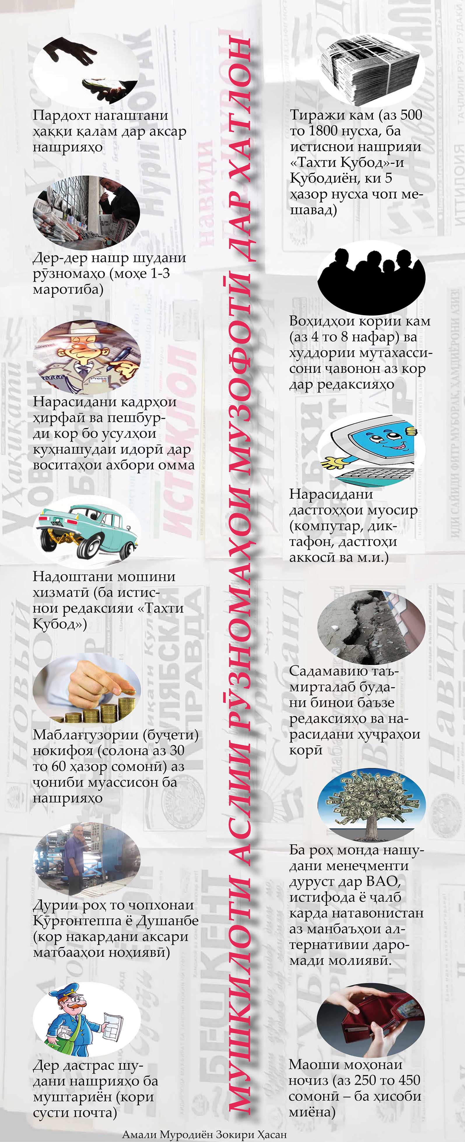 Камии теъдоди нашр, дер ба чоп расидан, дастмузди ночиз (аз 250 то 450 сомонӣ), норасоии дастгоҳҳои замонавӣ, дурии роҳ то чопхонаи Қӯрғонтеппа ё Душанбе, кор накардани бештари чопхонаҳои ноҳиявӣ, воҳидҳои кории кам ва худдории мутахассисони ҷавон аз фаъолият дар редаксияҳо, садамавию таъмирталаб будани бинои баъзе идораҳои ВАО ва нарасидани ҳуҷраҳои корӣ, маблағгузории нокофии рӯзномаи музофотӣ, пардохт нашудани ҳаққи қалам, пешбурди кор бо усули куҳнашудаи идорӣ дар расонаҳо, роҳандозӣ нашудани менеҷменти дуруст, дер дастрас шудани рӯзнома ба хонанда… Ин ҳама аз мушкилоти аслии нашрияҳои музофотӣ дар вилояти Хатлонанд, ки роҳи ҳалли зудрас мехоҳанд.