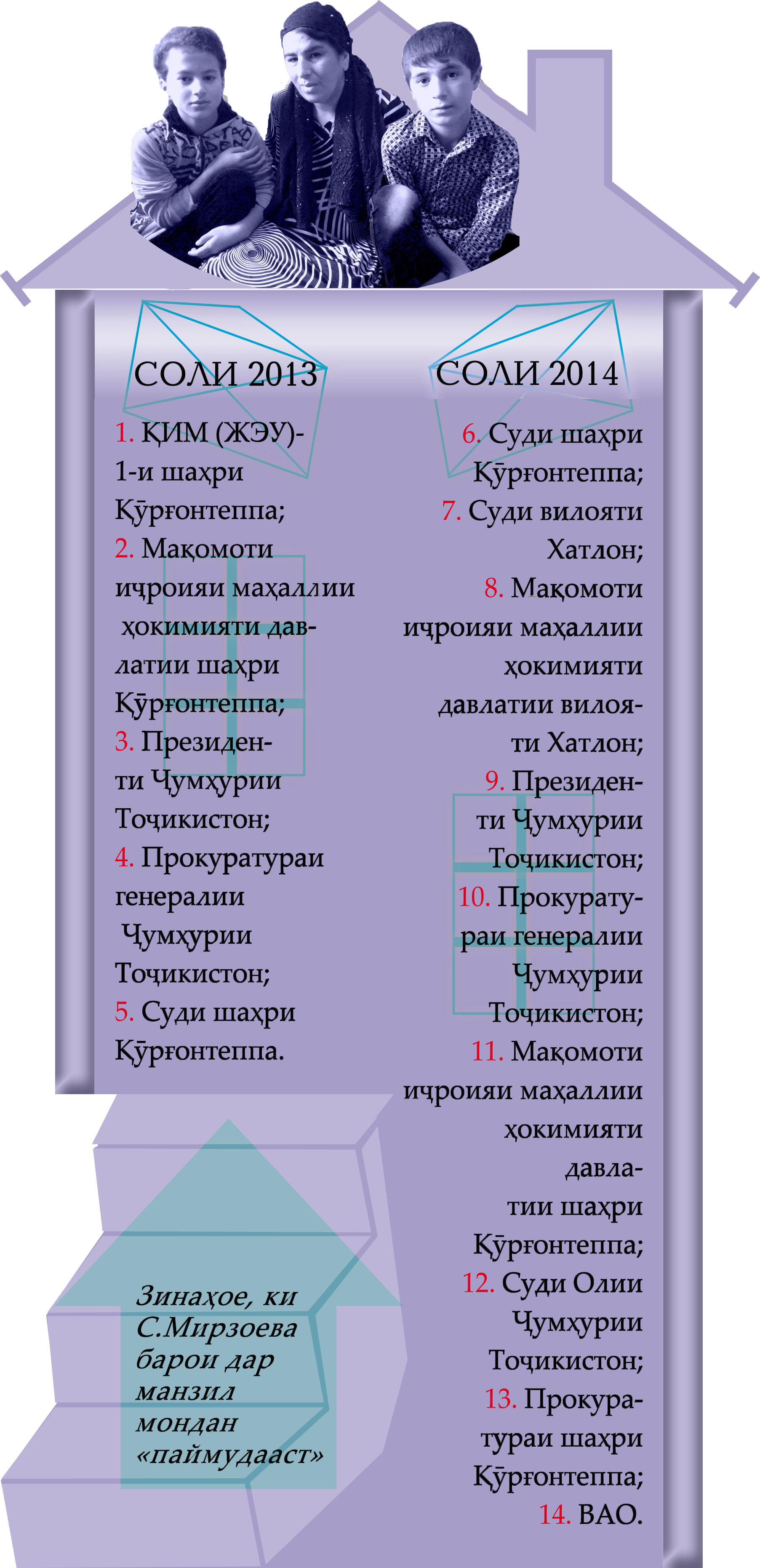 Баҳси манзили мазкур, ки дар шаҳри Қӯрғонтеппа, кӯчаи Кайҳоннавардон, бинои 28, ҳуҷраи 10 воқеъ аст, пас аз ирсоли аризаи шикоятӣ ба раисиҷумҳур Эмомалӣ Раҳмон аз ҷониби Сайёра Мирзоева дар моҳи марти соли 2013 зоҳиран ҳал шуда буд. Зимнан, Додгоҳи шаҳри Қӯрғонтеппа 5-уми августи соли 2013 парвандаро ба фоидаи С. Мирзоева ҷамъбаст карда буд. Вале шаҳрдории Қӯрғонтеппа дар муҳлати муқарраршуда аз рӯйи ин ҳукм ба додгоҳи зинаи болоӣ шикоят набурд. Зиёда аз ин, Шарифхон Самиев, собиқ раиси шаҳри Қӯрғонтеппа, ба зердастонаш супориш дода будааст, ки манзил ба номи хонум Мирзоева ҳуҷҷатгузорӣ шавад, аммо…
