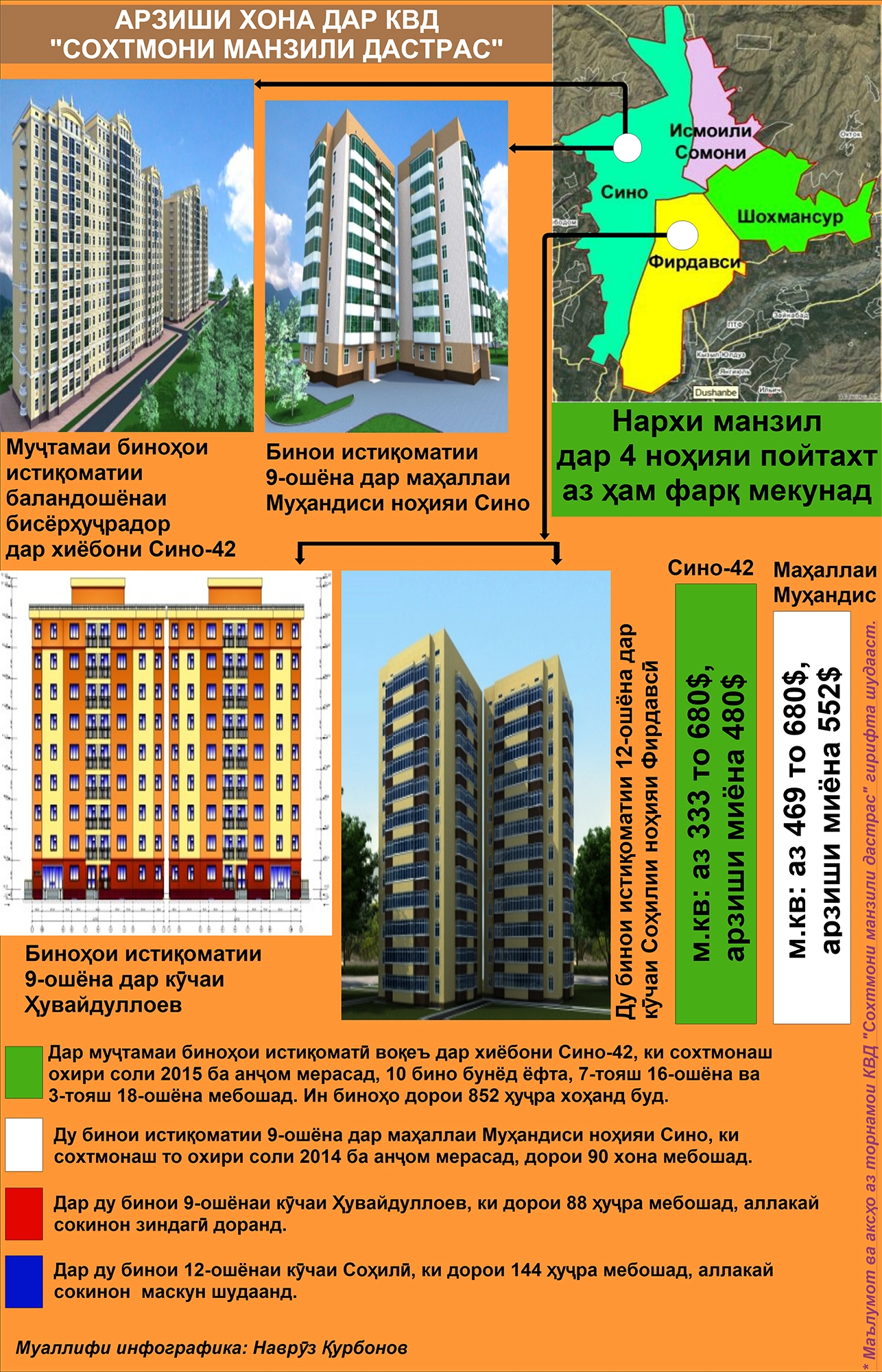 Бино ба иттилои Нурулло Наимов, раиси КВД «Сохтмони манзили дастрас», онҳо ба ҳукумати шаҳр тарҳҳои нав пешниҳод кардаанд, ки феълан дар баррасии шаҳрдорӣ қарор доранд. Аз соли 2012 инҷониб аз тарафи ин корхонаи воҳиди давлатӣ 4 бинои истиқоматии аз 9 то 12-ошёна ва дар маҷмӯъ 500 хонаи истиқоматӣ сохта, ба истифода дода шудааст. Айни замон сохтмони 12 бинои истиқоматии аз 9 то 18-ошёна идома дорад. Дутои он охири соли 2014 ва боқимонда соли 2015 ба истифода дода мешавад.