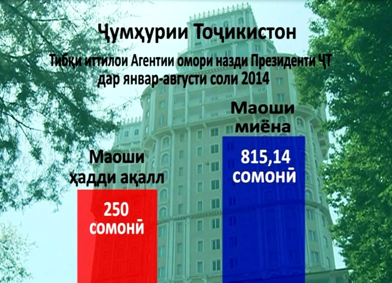 Ин дар ҳолест, ки моҳҳои январ-августи соли 2014 маоши ҳадди ақалл дар Тоҷикистон 250 сомонӣ ва маоши миёна 815,14 сомонӣ муқаррар гардида буд. Дар ин бора ба мо Абдувалӣ Қулов, масъули бахши омори демографӣ ва шуғли аҳолии Агентии омори назди Президенти ҶТ иттилоъ дод.