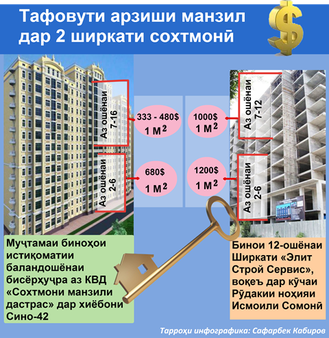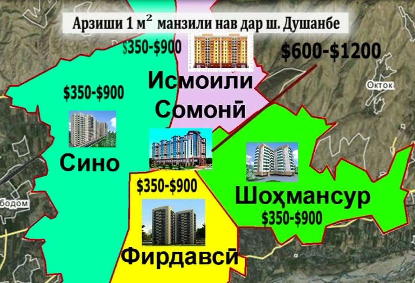 Як метри мураббаъи манзили навбунёд дар биноҳои баландошёнаи маркази Душанбе, вобаста ба ширкати сохтмонӣ, аз $600 то $1200 ва бештар аз он арзиш дорад. Ҳамзамон дар канори пойтахт нархи як метри мураббаъ аз $350 то $900 мебошад. Ин манзилҳо иборат аз чордевори холӣ буда, бидуни таъмири ороишӣ ба соҳибмулкон супорида мешаванд.