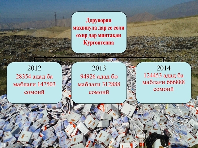 Ин чорабинии нобудсозӣ аз амалиёти ҳамсони пешин бо он фарқ мекунад, ки соҳибкорон ва муассисаҳои тандурустии минтақаи Қӯрғонтеппаи вилояти Хатлон маводи доруворӣ ва ороишиеро, ки муҳлати истифодаашон гузаштааст, ихтиёран ба анбори Раёсат барои безарарсозӣ оварда супориданд. Аммо дар солҳои қаблӣ як қисми маводи дорувории муҳлаташ гузаштаро агар худи соҳибкорон оварда месупориданд, қисмати дигарашро нозирони Раёсат зимни санҷишҳо ошкор ва барои нобудсозӣ мусодира мекарданд