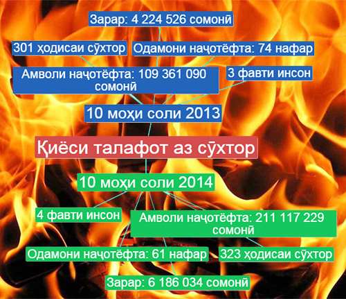 Ба муҷиби ин ноҷуриҳо имсол дар қиёс бо моҳи октябри соли 2013 ҳолатҳои сӯхтор – 22 дафъа, фавти инсон – 1 нафар (имсол дар маҷмӯъ 4 нафар) ва талафоти амвол ба маблағи 1 961 508 сомонӣ (имсол 6 186 034 сомонӣ) бештар шудааст.