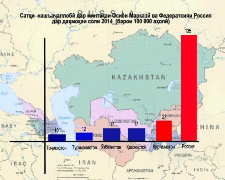 Тибқи иттилои Агентии назорати маводи нашъаовари назди Президенти ҶТ, дар Тоҷикистон нашъаҷаллобон аз сад ҳазор 10 нафарро ташкил медиҳанд. Дар ҳамин ҳол дар Туркманистон аз сад ҳазор нафар – 12 нафар, дар Ӯзбекистону Қазоқистон аз сад ҳазор нафар – 17 нафар нашъаҷаллоб будааст. Сатҳи баландтарини нашъаҷаллобӣ дар минтақаи Осиёи Марказӣ дар Қирғизистон ба қайд гирифта шудааст. Теъдоди нашъаҷаллобон дар ин кишвар аз сад ҳазор – 27 нафарро ташкил медиҳад. Омори нашъаҷаллобӣ дар Федератсияи Русия бештар аз кишварҳои Осиёи Марказӣ будааст. Дар Русия аз сад ҳазор – 135 нафар нашъаҷаллоб мебошад.